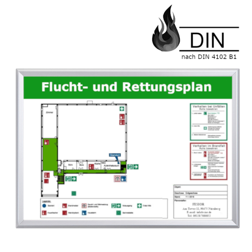 hochwertiger DIN A1 Aluminium Rahmen B1 Brandschutzzertifiziert nach DIN 4102 mit UV-resistender Antireflex-Schutzfolie, zur unsichtbaren Wandfixierung für Flucht- und Rettungspläne.